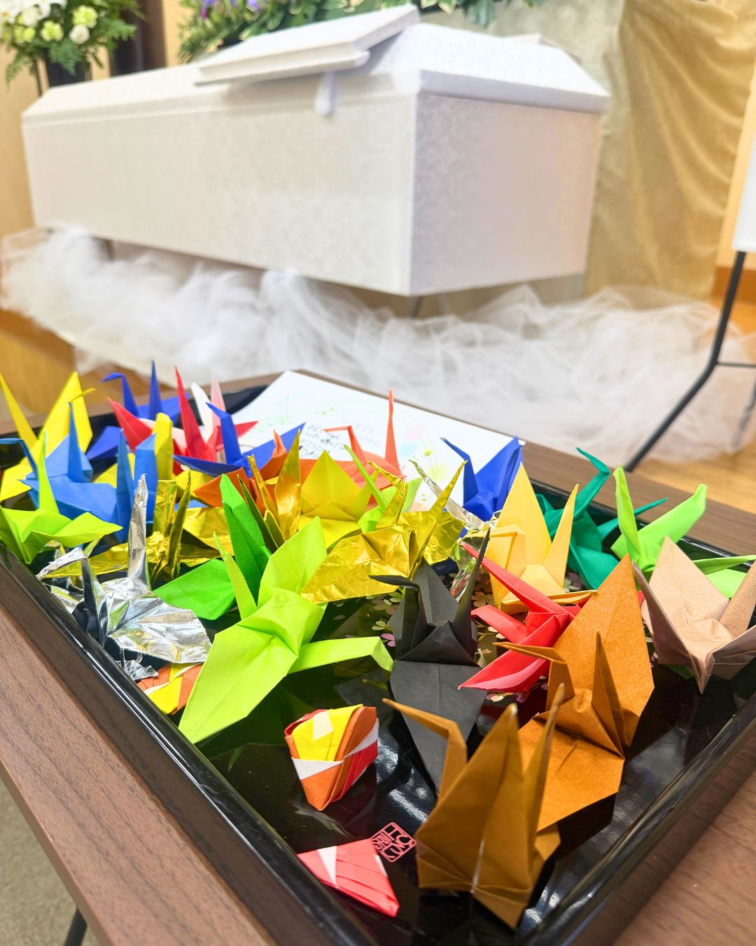 通夜のあと・葬儀の前には鶴を折り、メッセージを書かれました。