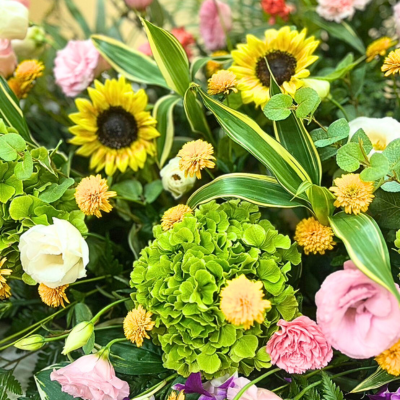 祭壇やご出棺花束にはK様のお好きだった紫陽花の花をお入れし、新緑などをイメージし明るい色にしました。たくさんのお花をお棺に入れることができましたので、K様はお花に包まれご家族様に見守られ、最期はご子息にお母さまに触れていただくようにお声をかけお別れとなりました。