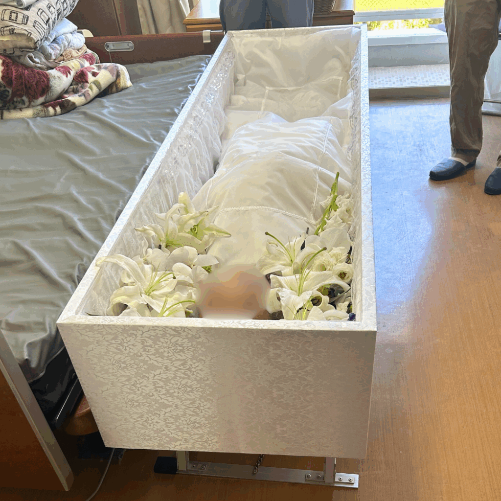 ご納棺は、お住まいだったお部屋にて、ご長男様とともに執り行いました。