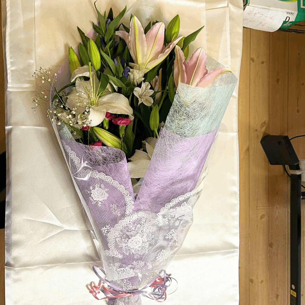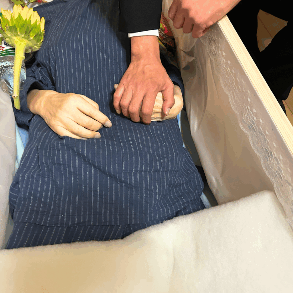 お花はご家族でご準備いただき、ご納棺時には好きな食べ物を入れ、最後に握手をしてお別れしました。